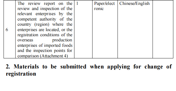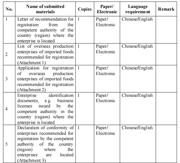 For the overseas production enterprises of 18 types of products including the meat and meat products, casings, aquatic products, dairy products, bird’s nest and bird’s nest products, bee products, eggs and egg products, edibles fats and oils and oil plants, stuffed pasta, edible grains, grain milling industrial products and malt, fresh and dehydrated vegetables as well as dried beans, seasonings, nuts and seeds, dried fruits, unroasted coffee beans and cocoa beans, foods for special dietary uses, health food, the competent authority of the country (region) where the enterprise is located shall review and inspect the enterprise and confirm that the enterprise meets the registration requirements, and then recommend the enterprise to the General Administration of Customs and submit the application materials.